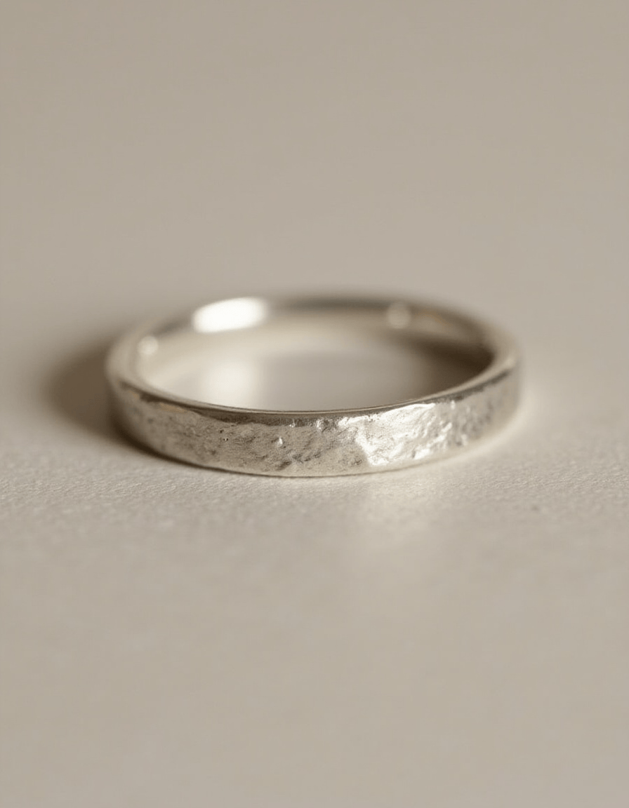 Sterling silver band with a light hammered and brushed finish. The texture is subtle so it pairs easily with other rings without looking busy.