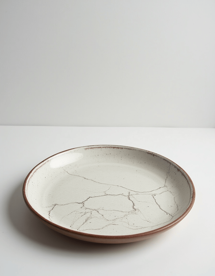 The plate is flat enough for serving, with a gentle rim that frames food without feeling heavy. The surface includes subtle texture, like wind patterns across sand or stone, and the glaze stays natural and grounded.
